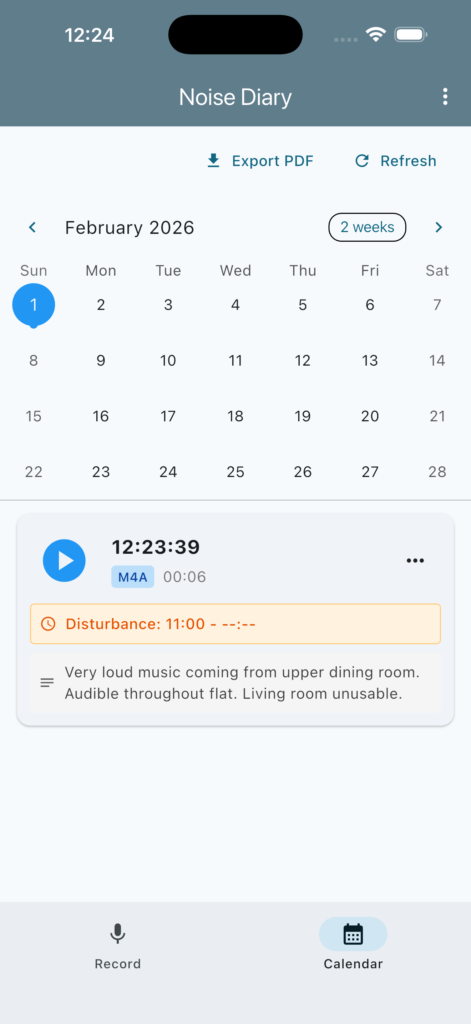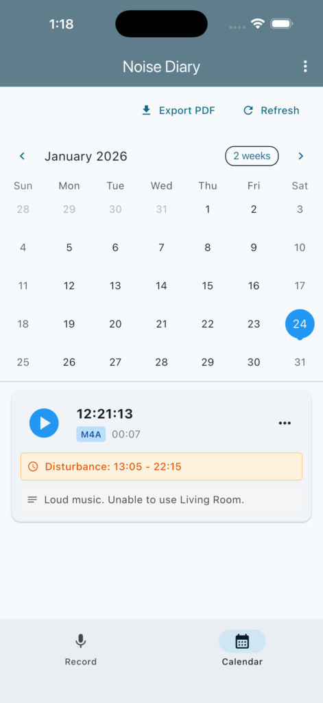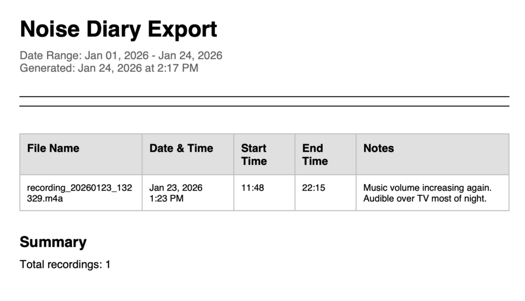 Perfect for recording problematic noise events, monitoring patterns, and building evidence if needed.
