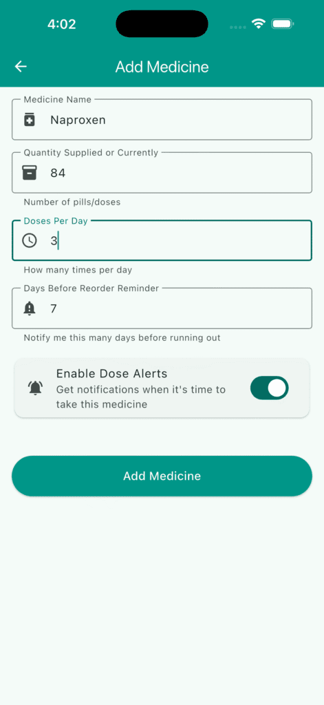 - Late Dose Rescheduling: Automatically adjusts remaining doses if a dose is taken late