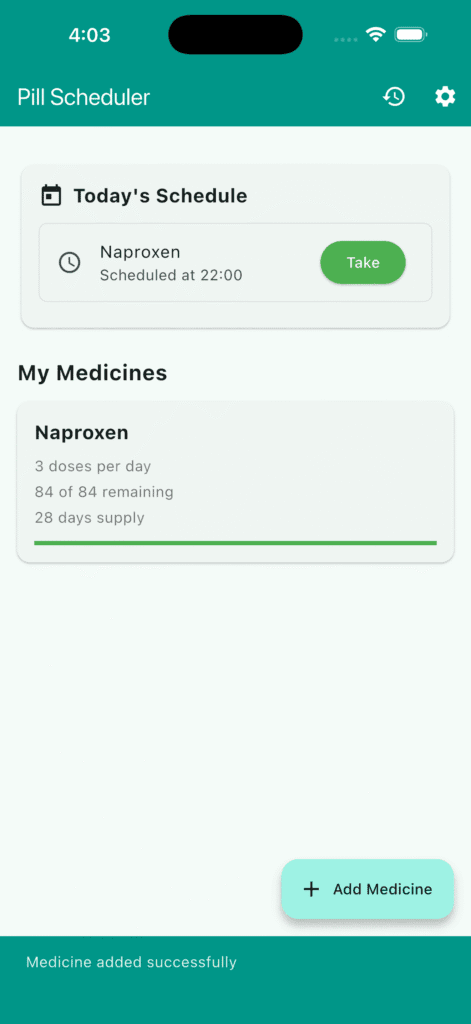 - Home Screen: Overview of today’s schedule and all medicines